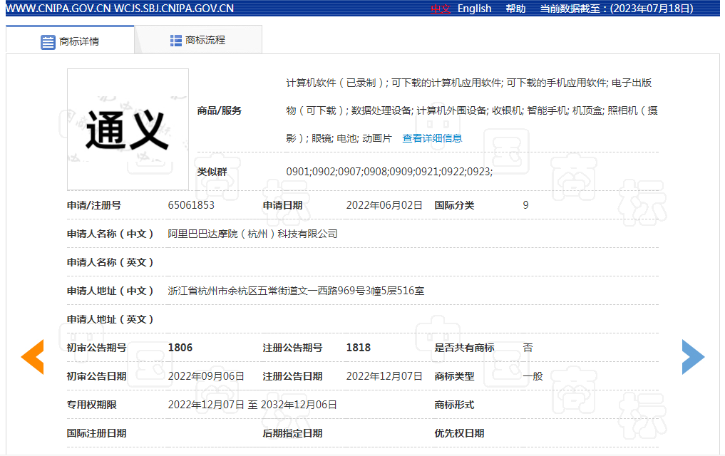 #商标# 阿里,阿里达摩院在2022年6月提交注册商标“通义”,包括三个大类:9类、42类、38类。下面是在知识产权局官网公开可查询的信息
