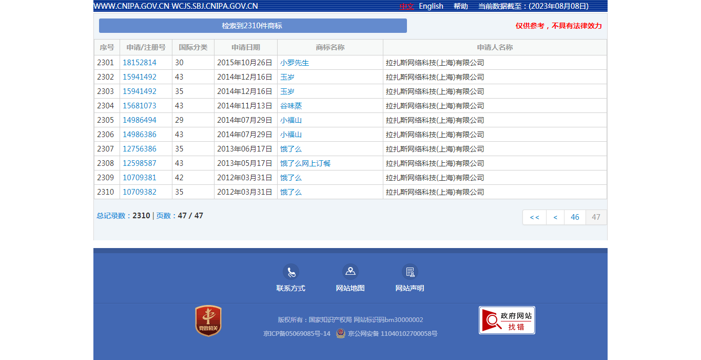 拉扎斯网络科技(上海)有限公司,这个主体下有各类商标,2310个。